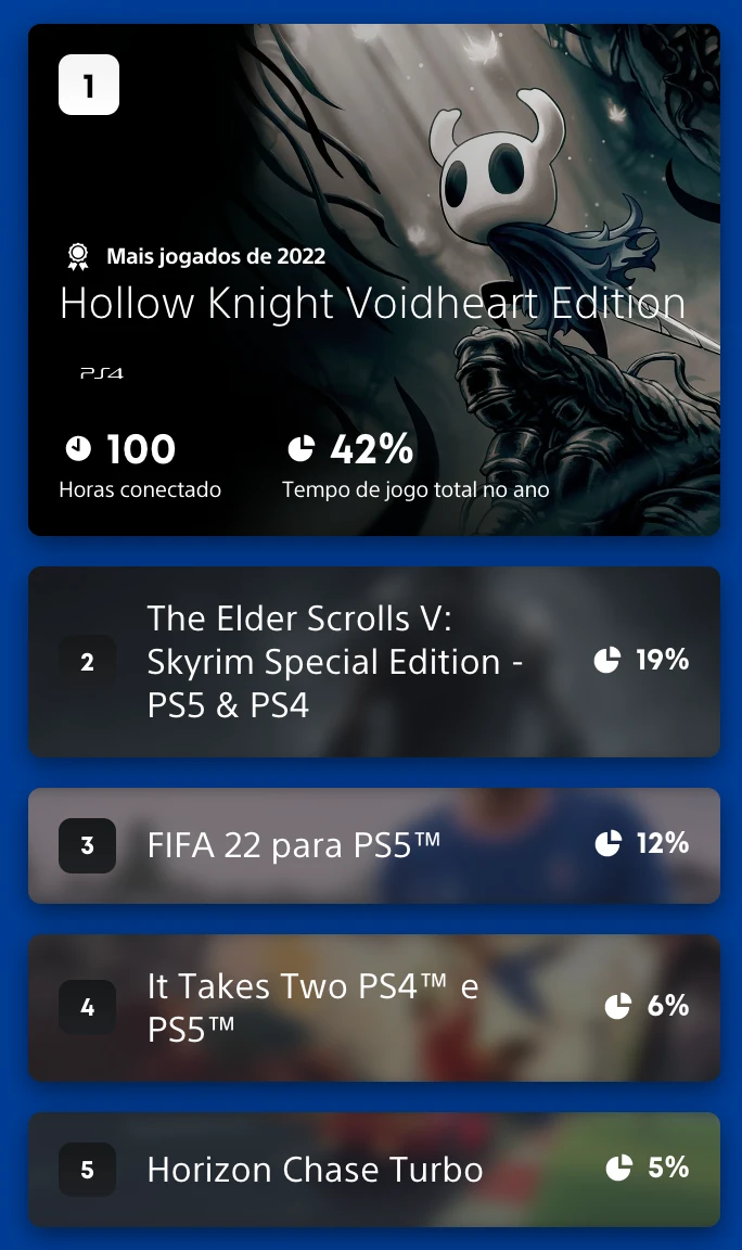 I played 238 hours in 19 different games over 143 days. Playstation says it’s 22% (43h) more than last year, but I don’t feel like that. Here’s the breakdown of my top 5 games: