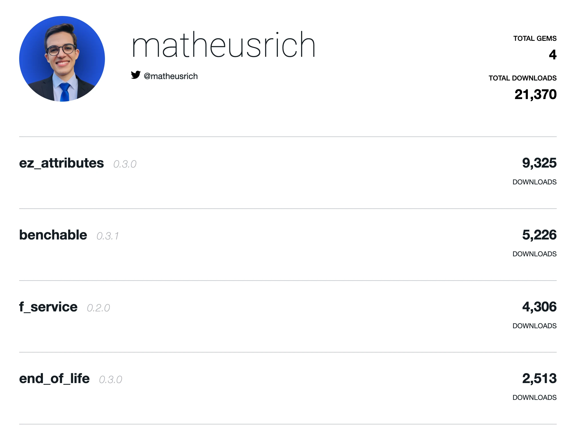 January this year, I released my fourth gem: end_of_life, a gem that helps you find which projects you have that use a deprecated Ruby version. It was one of those ideas I couldn’t take out of my head, so I hacked the first version during a weekend. It is pretty simple, but I think it has a nice UI, and I like how I handled errors using monads.