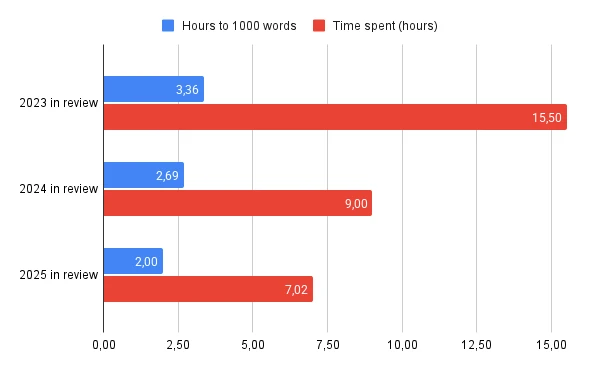 That made my writing speed increase by approximately 35% compared to last year (from 371 to 500 words/hour).