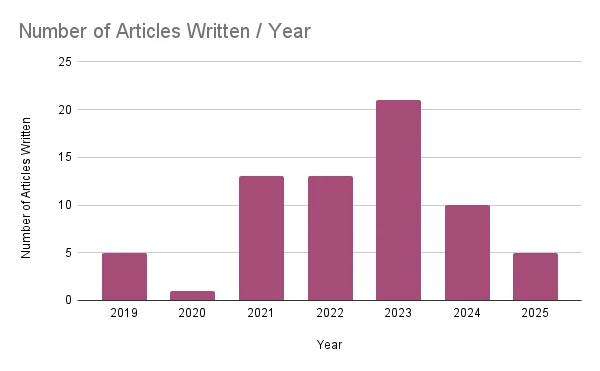 I wrote 5 articles in 2025. That is half of what I wrote in 2024, and the lowest number since 2020. Of course, I had a lot on my plate this year, but I think I made up for it with the talks.