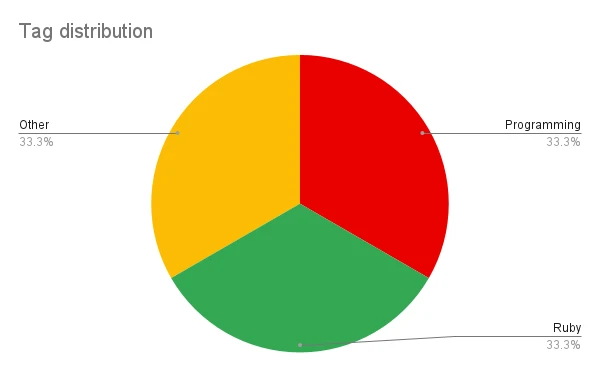 The articles were fairly distributed throughout the year, with the 3rd quarter being the most active with two articles. One of them was a guest post for App Signal about Ruby Parsing with Prism, but it was only published in 2026.