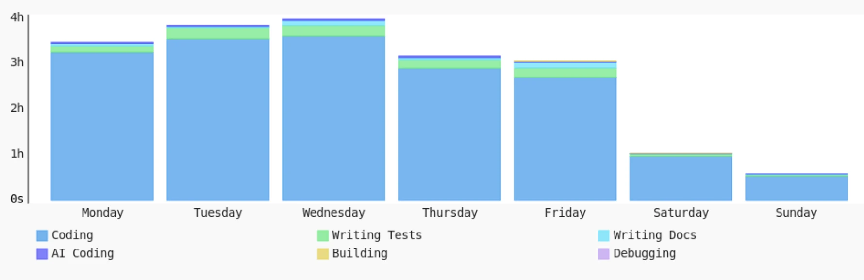 According to WakaTime, I logged almost 999 hours of coding this year, averaging about 3 hours and 13 minutes a day. That’s a significant jump (+41%) from last year’s 704 hours (roughly 2 hours and 45 minutes/day). GitHub confirms this, showing that I made 4006 commits, nearly 60% more than last year and an all-time high for me.