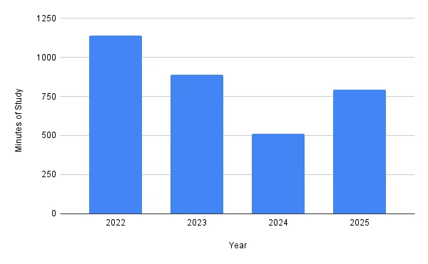 Another year of Duolingo Italian! I spent 793 minutes learning (55% more than last year), practiced on 339 days (93% of the year), and kept my streak alive for 1119 days total. That’s over 3 years without breaking the chain.