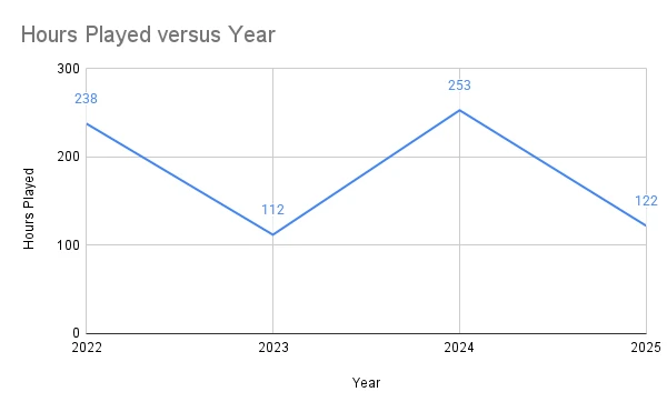 Contrary to last year, I played a lot fewer games. Yes, parenting hit me hard, but I was also focused on so many other things. Unfortunately, I didn’t see my Playstation Wrapped while it was available, so I don’t have exact numbers, but I have a good estimate. It’s a shame Playstation doesn’t have a way to retrieve my game data after the fact (no API, no official app to list it). I only played Overcooked with my wife, and by the end of the year I started Hollow Knight: Silksong.