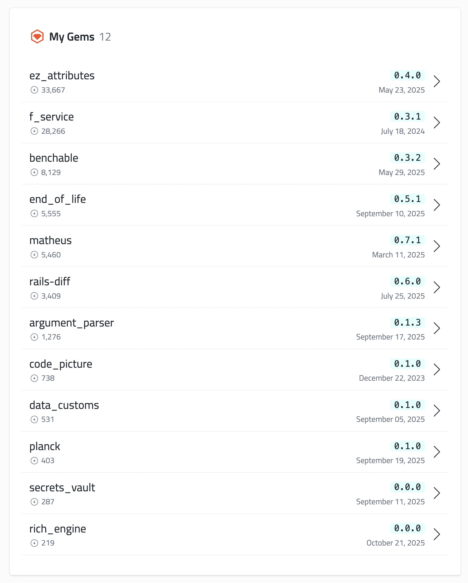 My gems were downloaded 87,940 times in total. That’s a ~69% YoY increase. I’ve released a number of new gems, but the most important are: