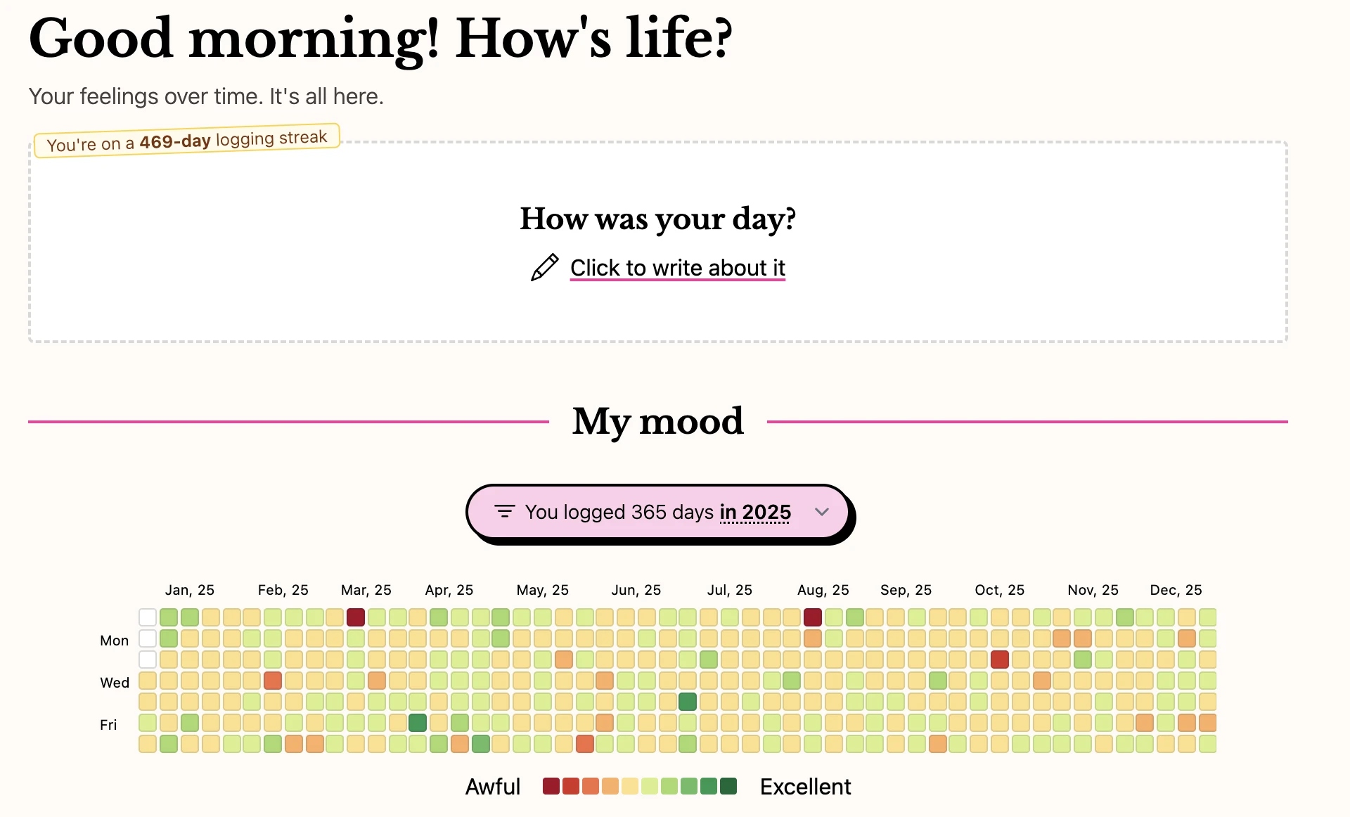 Late 2024 I started working on Memopack, an app I’m writing for myself to replace a bunch of Google Keep notes and other stuff I had scattered around. I wanted to have a single place to keep a journal (with mood tracking), all my notes, todos, and other things like bookmarks.